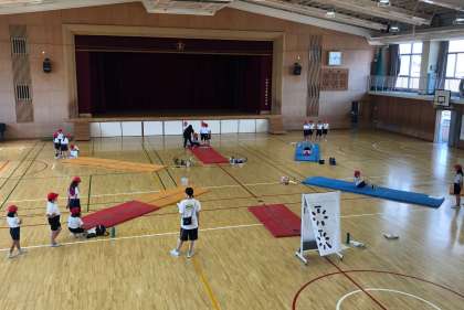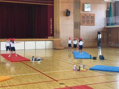 今年度の研究テーマ「互いに学び合い、高め合う体育科の授業づくり」に関する、3年生でのマット運動の授業です。