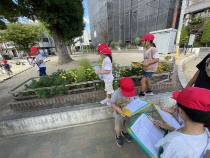 公園についてから、公園にはどんな遊具があるのか、どんな植物があるのかを見つけてカードに記入しました。