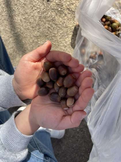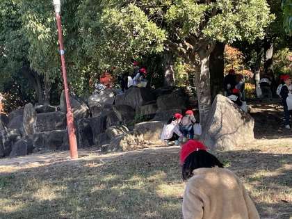 紅葉した葉っぱをひろったり、どんぐりを探したり、時間いっぱい公園の中で秋のものを探しました。