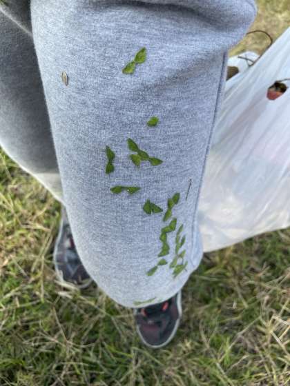 草むらの中で夢中になって探し、笛の合図で集合すると、子どもたちの服のいろんなところにくっつき虫がくっついていました。