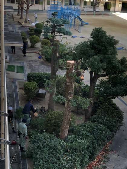 ※校内の管理作業員だけではできない作業を、大阪市校園営繕園芸事務所に依頼し作業してもらいます。