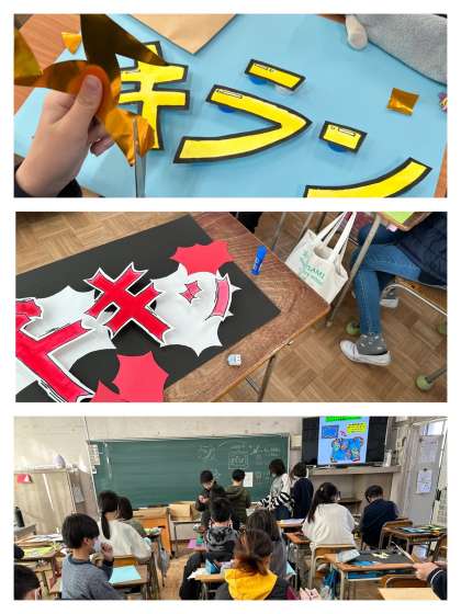好きなオノマトペを選び、そのオノマトペをイメージしてデザインしています。今日は、ボトルキャップを貼り付けて文字を浮かせたり、迫力を出すために飾りを付けたりしました。完成が楽しみです!