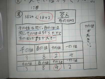 算数科の学習で3824と3842の大きさのくらべ方を考えました。