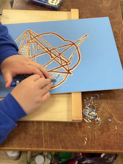 彫刻刀を使って、一人一人が様々な模様を線の中に彫っていました。