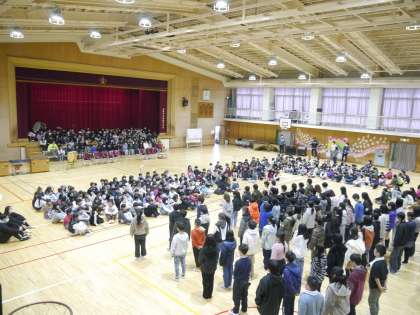 1年生から5年生の児童がこれまでお世話になった6年生への感謝の気持ちを伝え、みんなでお祝いをしました。