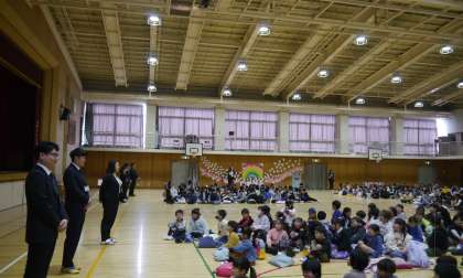 始業式に続いて、着任式です。新しい教職員のみなさんに子どもたちは、興味津々です。