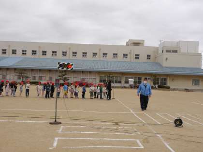 1・2年生は、運動場を町とみなし、横断歩道の渡り方や信号機の確認などの練習をしました。