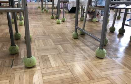 数年前から児童の机・いすにテニスボールをつける取組を続けています。