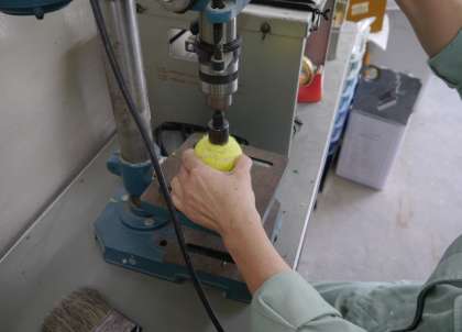 とある保護者の方からいただいた古いテニスボールを一つ一つ、管理作業員さんが穴をあけてくれました。