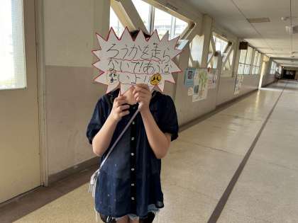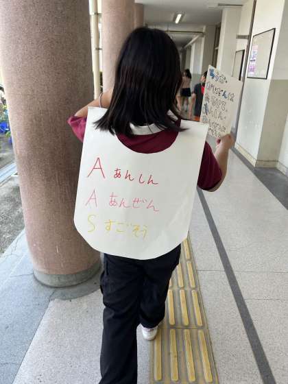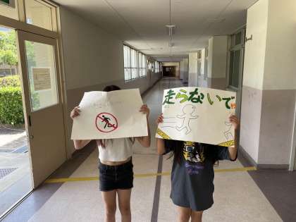そこで、5年生はポスターやたすきをかけて廊下や階段でみんなが安心・安全に過ごせるように呼びかけている取り組みを行っています。