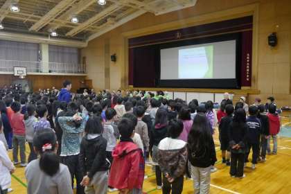 そのあとには、「ありがとうの花」を子どもたち全員で大合唱しました。歌詞にでてくる「ありがとう」のフレーズには、力がこもっていました。子どもたちは精一杯、感謝を表そうとしているのが、よく伝わってきました。