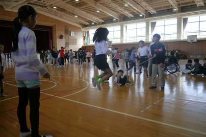 途中、おおなわが苦手でなかなか一歩が踏み出せない子どももいましたが、まわりの子どもたちの声援の中、目をつぶりながらも一生懸命跳ぶ姿が見られました。