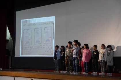 今日は集会で、4年生による総合学習(「よさみタイム」)の発表がありました。