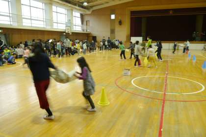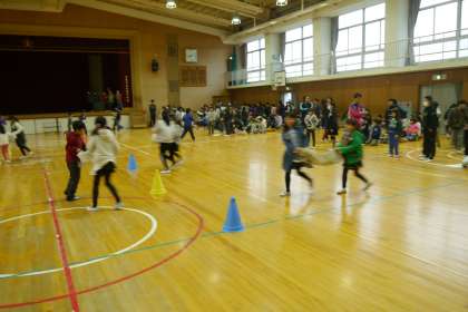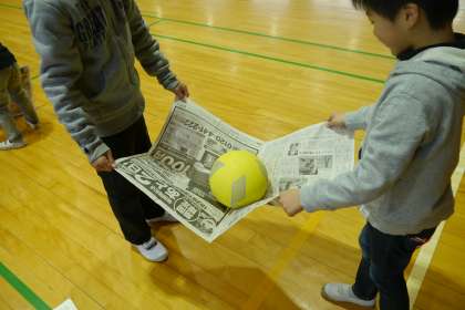 新聞紙でボールを運ぶゲームです。高学年と低学年でペアを組み、協力しながら運んでいました。朝から雨で冷え込みがきつい体育館でしたが、元気に取り組んでいました。