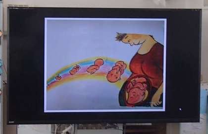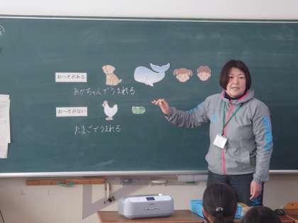 おへそクイズから始まり、哺乳類は、どの動物も母親の胎内で育つことを知り、自分たちも、お母さんのお腹の中で大切に育てられてきたことを知りました。