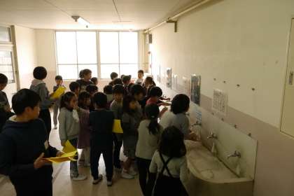 2時間目終了後の休み時間に、保健委員会の子どもたちが「正しい手の洗い方」について声掛けをしています。この習慣が定着できるように、ご家庭でのご協力もお願いします。