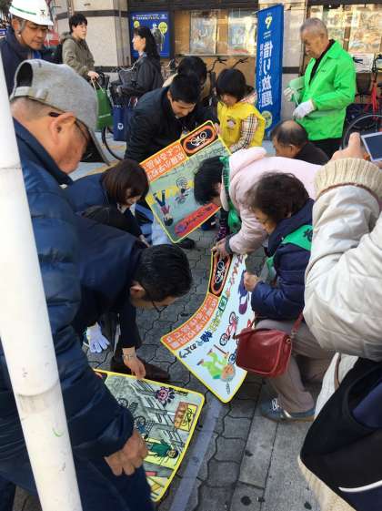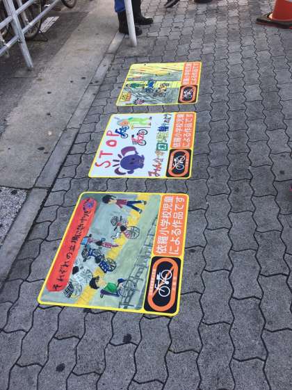 夏休みの自由課題として提出したポスターの代表作品が、駅前に取り付けられました。