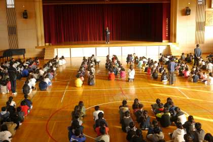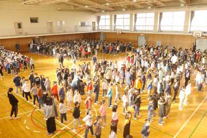 校歌を歌い、その後に校長先生が「規則正しい生活で元気に過ごそう」との話がありました。