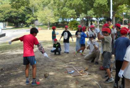 ご飯を作るために、仲間と力を合わせ、火をおこしを体験しました。