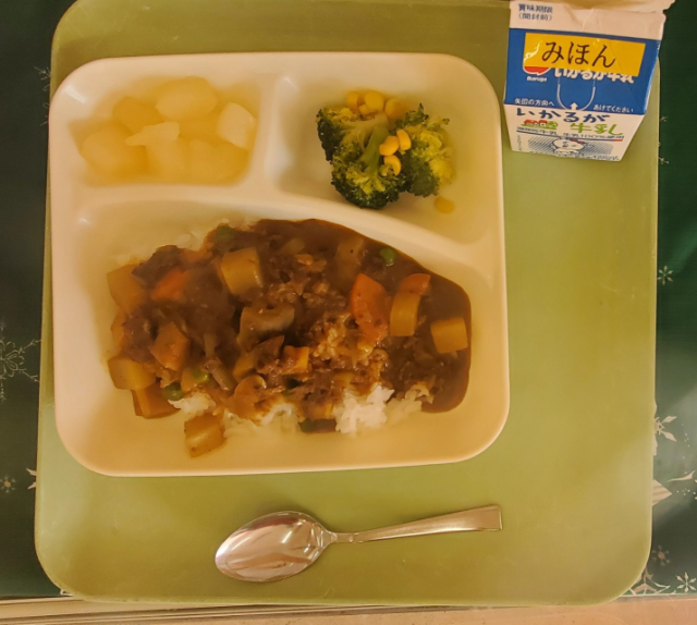 ごはん 牛乳 冬野菜のカレーライス ブロッコリーとコーンのサラダ 和なし(カット缶)です。