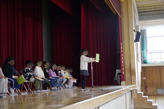 各学年の代表者が、2学期の『がんばり』を全校児童の前で発表しました。