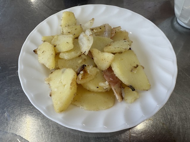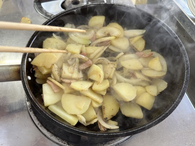 じゃがいもの皮をむいてゆでたり、たまねぎやベーコンを切ったりしました。