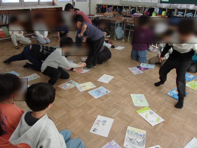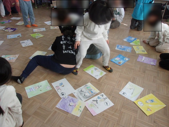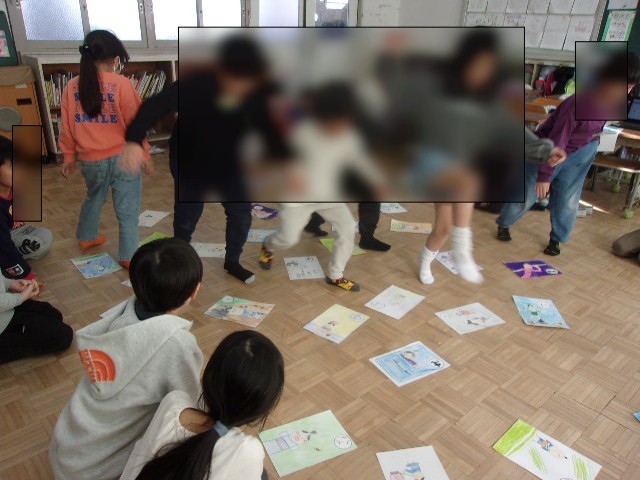 十二支の学習では、ねずみから順番にポーズを考えて覚えたり、十二支の歌を歌ったりして覚えました。いろは歌の学習では、巨大いろはかるたを作ってみんなでかるたをして遊びました。チーム対抗で枚数を競いました。みんな必死にかるたを取っていました。