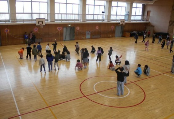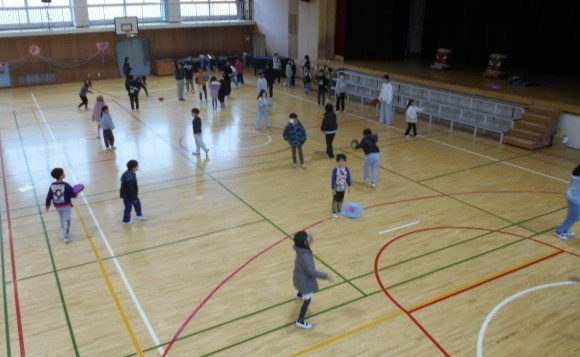 「空飛ぶお皿をキャッチ&シュート」というフリスビー遊びと、だるまさんが転んだをアレンジした「だるまさんの一日」という遊びです。