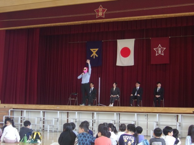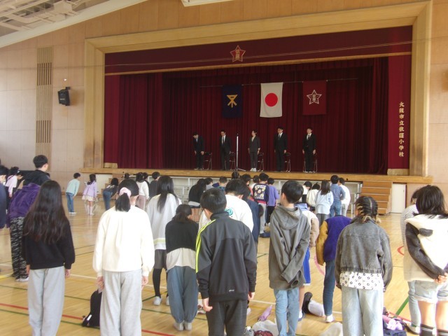 6名の教職員が新たな場所へ旅立ちます。お世話になった教職員とのお別れにたくさんの児童、保護者の方々も駆けつけてくださり、感謝の気持ちを届けることができました。「夏休みマン」「冬休みマン」と事あるごとに依羅小学校に現れていたヒーローも、今日は「お別れマン」として登場し、笑顔もあふれる離任式となりました。