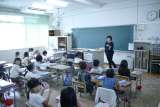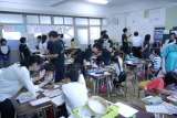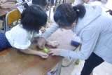 6年生の子どもたちが、1年生〜5年生の子どもたちと一緒に「折り鶴」を作っています...