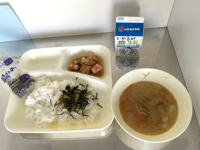 〈献立〉こまつなっ葉めし(きざみのり)、さけの和風マリネソースかけ、じゃがいもと...