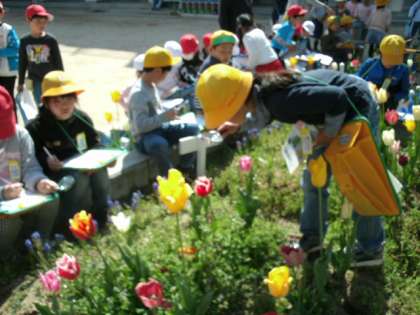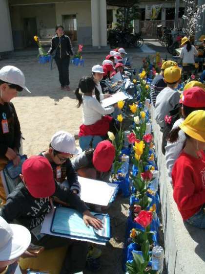 2年生が大切に育てたチューリップが美しく咲いています。2年生は観察してパスで丁寧に絵を描きました。3年生は虫メガネを手に花びらの形や枚数を観察し、カードにまとめていました。まだまだ校庭には春はありそうです!