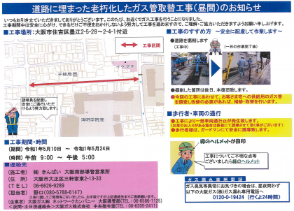 明日10日(金)から、千躰郵便局前の道路でガス管取替工事が行われます。実施期間や時間は次の通りです。ご家庭でも、近くを通る際には十分気をつけるようお話しください。学校では学級担任が子どもたちに指導します。よろしくお願いします。