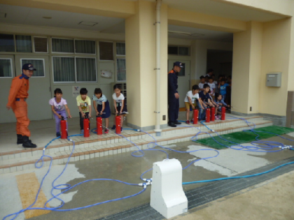 15日 住吉消防署の方々をお招きし、2・4年生が防災学習に取り組みました。消火器の使い方や煙の中での通行は、実技を通して学習しました。そして、DVD視聴で地震・津波からの避難について学びました。