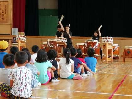 13日 浅香太鼓集団「獅子」のみなさんにお越しいただき、和太鼓の体験教室を開催しました。体験の前の模範演奏に子どもたちはお腹に響く迫力満点の音に驚いていました。基本姿勢や叩き方を学び、息を合わせて緩急強弱をつけたり、同じリズムを連続して打ったりしました。最後はパートに分かれてオリジナル曲の演奏に挑戦しました。たくさん太鼓に触れることができ、集中力もつく貴重な体験ができました。みんなの真剣な眼差しが印象的でした。