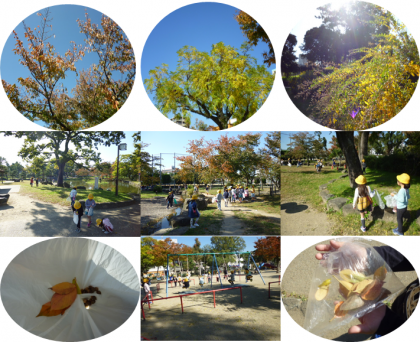 13日 午前中に住吉公園へ秋を見つけに出かけました。黄色や赤色に変わっている葉やどんぐりを見つけ、ビニール袋に入れて持ち帰りました。秋を見つけた後に、遊具のある広場で遊んで学校に戻りました。遠足の時よりも歩くスピードが上がり、頼もしく感じました。