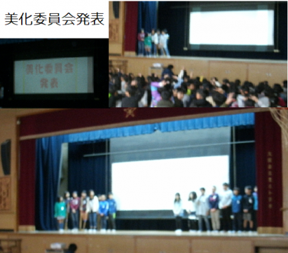 5日 美化委員会のみなさんが発表をしました。「掃除をして美しい環境にすることは、安全に過ごせることにつながる」と説明し、清掃活動の呼びかけをしました。