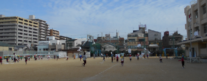 16日 本校の運動場で、園児のみんなが元気よく凧揚げをしました。広い運動場を力いっぱい走りながら、空に上がる凧を操っていました。懐かしい風景が見られました。
