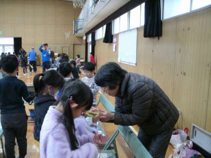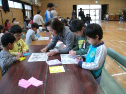 15日 地域の方々にお越しいただき、昔遊びを教えていただきました。子どもたちは、お手玉、こま、はねつき、あやとり、おりがみ、けん玉の6つのコーナーを回りました。それぞれのコーナーで一生懸命取り組み、「できた!」と喜び何度も挑戦していました。今回教わったことを保育園や幼稚園のみんなに教えるため、生活科の学習で練習を続けていきます。