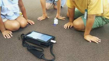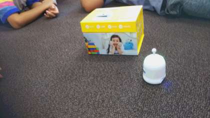 タブレットを使って、プログラミングロボットを動かしました。頭のランプをいろいろな色に点灯させたり、前進、後進させたり、左右に曲がらせたり、クルクル回転させたり、思い通りにプログラムして、動きを楽しみました。「かわいい」とたいへん好評でした。