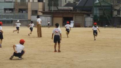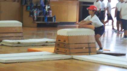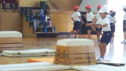 運動場では「かけっこ」、講堂では「跳び箱」の学習をしました。