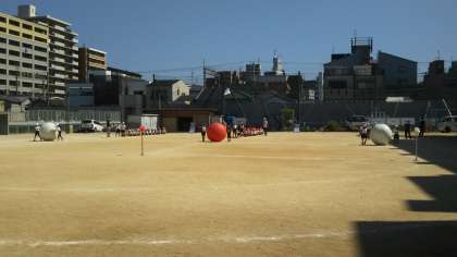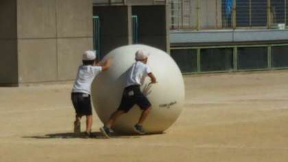 2年生は、大玉転がしの練習を学級対抗で行いました。