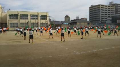 6年生は、学習参観(体育)に向けて、団体演技の練習をしました。