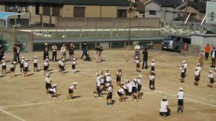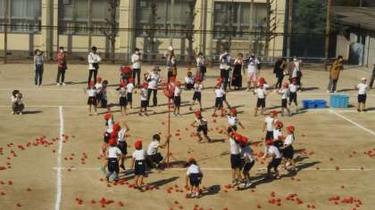 5時間目に、1年生が学習参観(体育)を行いました。玉入れをしました。