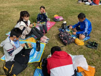 10月29日(木) 宿舎に着きました。宿舎の前でお弁当を食べています。