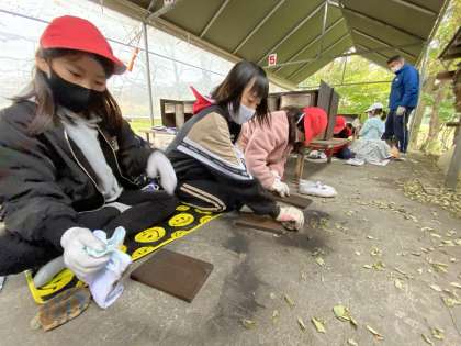 焼き板づくり。しっかりと磨いて、きれいに色付けをしました。思い出の一品ができました。