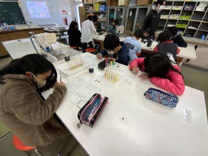 11月27日 墨江丘中学校に理科の授業を受けに行きました。『水溶液を科学する』『めざしの解剖』『光と音の性質』から選択して、興味のある授業を受けました。楽しんで授業を受け、中学校の雰囲気を感じることができました。