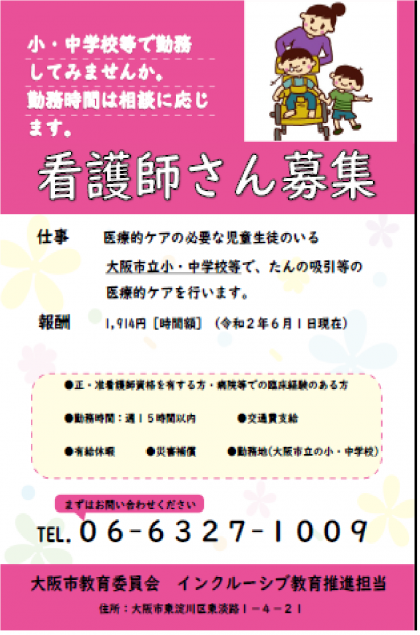 大阪市の小学校や中学校には、たんの吸引や胃ろう、導尿等、医療的ケアを必要とする子どもたちが多く学んでおり、安心・安全な学校生活を送るためには、看護師さんのサポートが必要です。