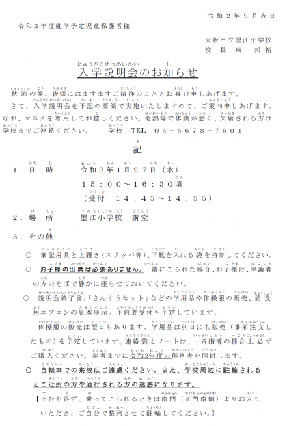 1月27日(水)午後3時より、万全の新型コロナウイルス感染症予防を行い、予定通り講堂にて、入学説明会を行います。