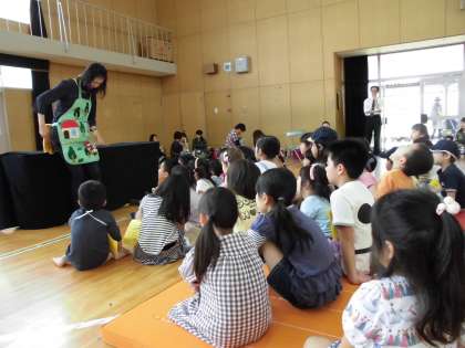 4月29日 昭和の日に はぐくみネット主催の「子ども110番の家」シールラリーが行われました。毎年、1年生を対象に、自分たちの家の近くの「子ども110番の家」をさがすシールラリーを行っています。今年は1年生の子どもの弟や妹もたくさん参加していました。地域活動協議会々長 鈴木様からお話を伺った後、いよいよ出発です。講堂へ戻ってきてからは図書ボランティア「コノユビトマレ」の方たちから紙芝居やエプロンシアターなどをしていただきました。